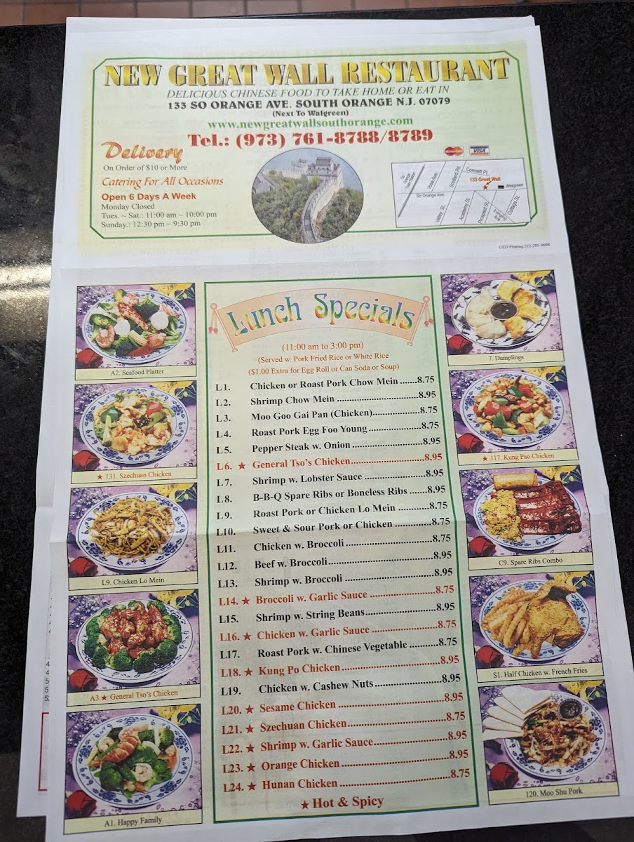 The menu at New Great Wall offers a wide variety of dishes to suit every taste, making it a go-to spot for anyone craving Chinese cuisine. For appetizers, you can start with Vegetable Egg Roll or Shrimp Egg Roll, and for something more indulgent, try the Fantail Shrimp or BBQ Beef Stick. The soup options include comforting favorites like Wonton Soup and Egg Drop Soup. Teriyaki lovers can enjoy Chicken Teriyaki, Shrimp Teriyaki, or Beef Teriyaki. For rice dishes, Shrimp Fried Rice and Chicken Fried Rice are popular choices, while the Beef Chow Mein and Mixed Vegetable Chow Mein offer hearty noodle options. If you're in the mood for a lighter dish, Sweet and Sour Pork or Sweet and Sour Shrimp are flavorful choices, and there are plenty of meat and seafood options, such as Pepper Steak with Onion and Shrimp with Lobster Sauce. The restaurant also caters to vegetarians with options like Vegetable Delight and Broccoli in Garlic Sauce. For a special treat, try the General Tso’s Chicken or the Seafood Platter. Lunch specials include combos like the Chicken Chow Mein Lunch Special and Roast Pork Egg Foo Young Lunch Special, all served with a side of rice and a fortune cookie. Don't forget to pair your meal with a refreshing Homemade Ice Tea or a 20 Oz. Bottled Soda. The diverse menu ensures that there's something for everyone, whether you're looking for a quick bite or a full meal.